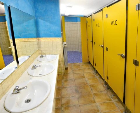 Exteriors amb esplanades de joc, sorral i piscina amb gespa, zones de picnic i lavabos exteriors.