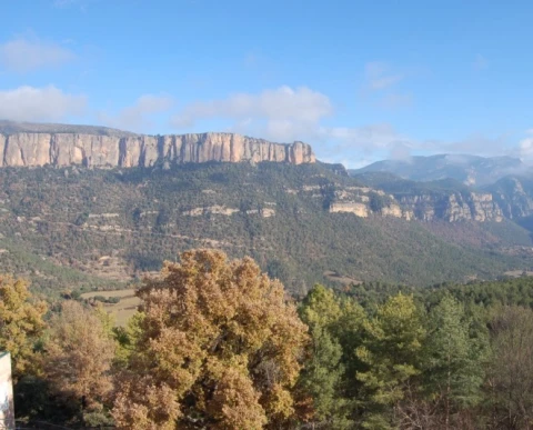 Antiguo edificio de piedra con la iglesia al lado. Situado en un punto elevado de alta montaña bajo los espectaculares riscos de Busa.